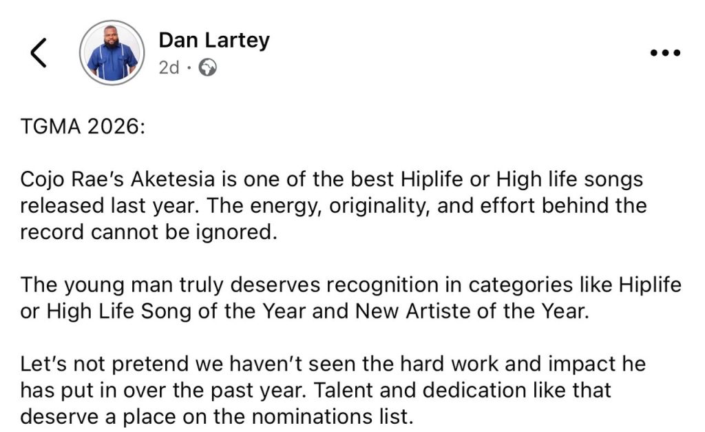 Stop Overlooking the Impact of Cojo Rae — Dan Lartey Calls Out TGMA Board Over Recognizing Hard Work